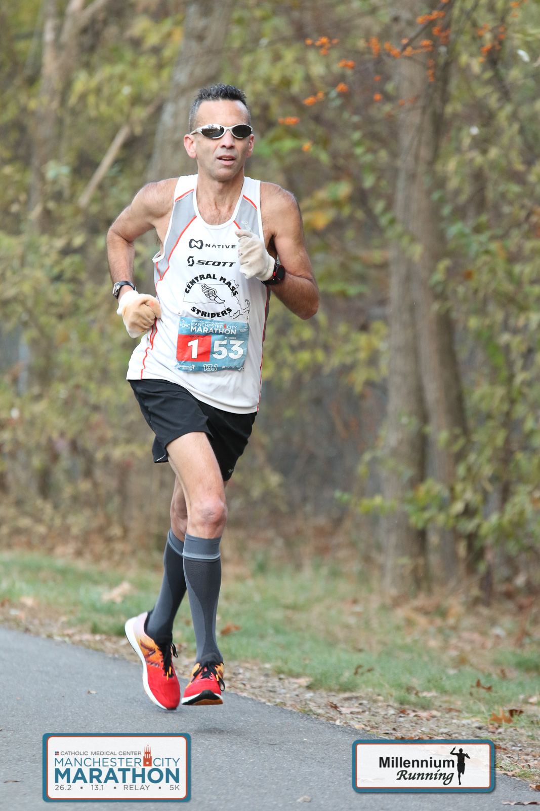 I saw my prime competition Jeff Walker who I'd beaten by a scant couple of seconds at the 10 mile. He'd be starting a minute plus behind me so hopefully I wouldn't be seeing him. My goal was to get through the first 5 mile section on the West side of the Merrimack River in control. This course has a LOT of tough long uphills with absolutely brutal SHORT downhills. I kept thinking "get to the 5m mark and see how you feel". The tough little hill heading up to downtown got me to 5 miles right at 32 minutes which had me right on goal pace.